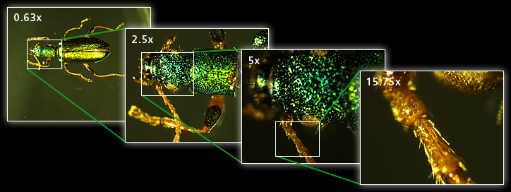 Magnification range 0.63x – 15.75x 0.75x – 13.5x