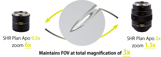 Nikon’s newly developed objective lens series, the SHR Plan Apo series, offers a high resolution of 1100LP/mm (Observed value, using SHR Plan Apo 2x at maximum zoom). The new SHR Plan Apo series of lenses deliver brilliant images with true-to-life colors.