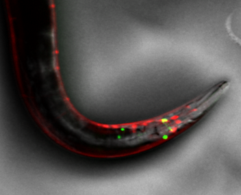 Fluorescence and OCC images of a live C. elegans expressing GFP- and RFP-neurons