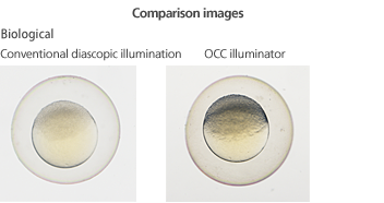 The new LED DIA Base with a built-in OCC illuminator generates minimal heat, consumes little power and is long-life. This illuminator can enhance the contrast of uneven surfaces, such as that of an embryo.