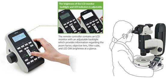 The all new remote controller provides easy access to zoom and focus controls and is designed for both right and left hand use. The remote controller contains an LCD monitor with an adjustable backlight which provides information regarding the zoom factor, objective lens, filter cube, and LED DIA brightness at a glance.
